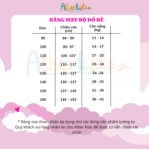 Bảng size cho bé tham khảo với những bé có chiều cao và cân nặng cùng trong khoảng size này thì nên chọn đúng bảng size.