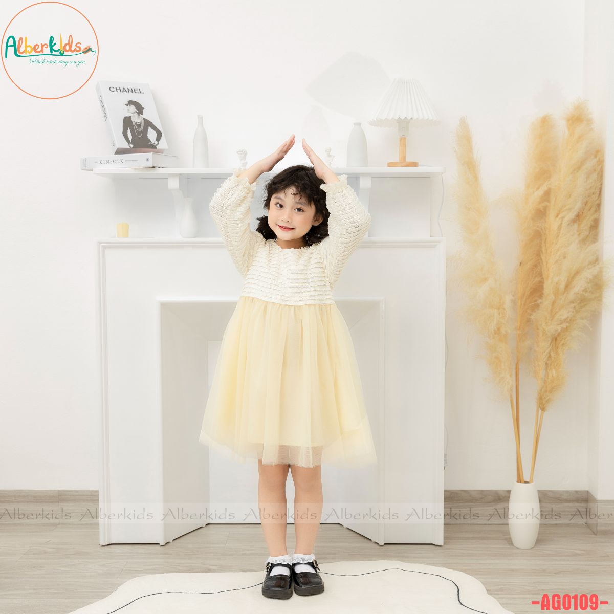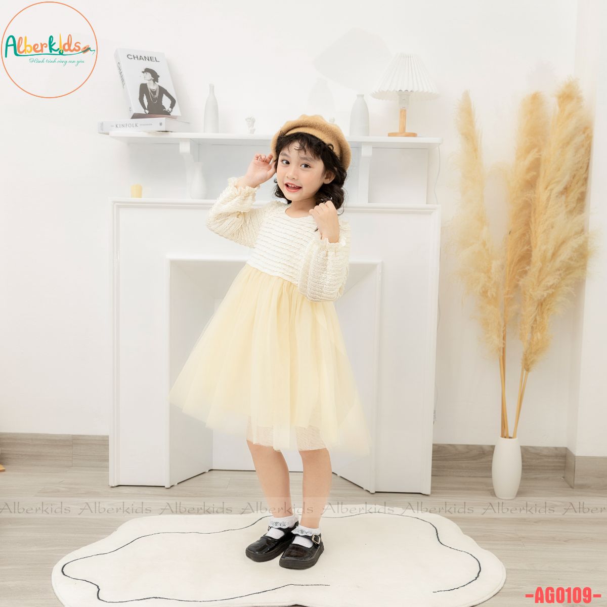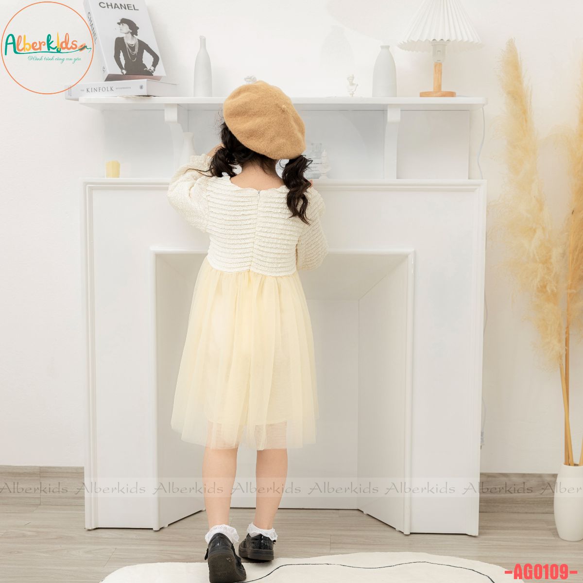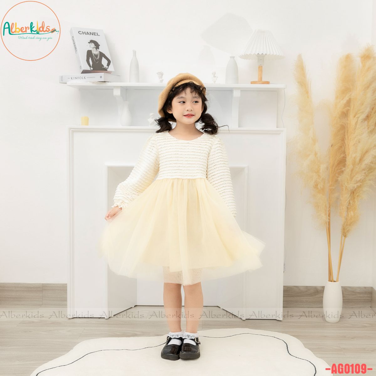 AlberKids - Hành trình cùng con yêu - Váy bé gái ALBERKIDS dài tay công chúa trắng kem phối lưới xinh đẹp cho trẻ em 2,3,4,5,6,7,8,9,10,11,12 tuổi AG0109